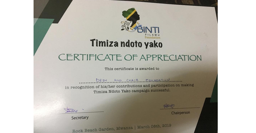 On 8th March 2019, marking the International women’s Day, The Desk and Chair Foundation was handed over a certificate of appreciation by BINTI FILAMU FOUNDATION for activities that are empowering the women,widows ,single mothers and their children.